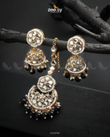 The Anam Earrings exude regal charm with their intricate Kundan work and delicate pearl embellishments. Featuring a classic jhumka design paired with a statement Bindiya, this set is perfect for elevating any bridal or festive look.