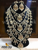 The MALA NECKLACE-0273 is a breathtaking masterpiece of traditional luxury, designed to create a dramatic and sophisticated royal silhouette. Expertly handcrafted with a radiant Golden Finish, this extensive multi-layered Mala features five graduated strands of lustrous seed pearls. The design is punctuated by intricate floral-filigree medallions encrusted with high-clarity diamond-cut crystals and finished with elegant pearl teardrop droplets, capturing the serene essence of South Asian heritage.