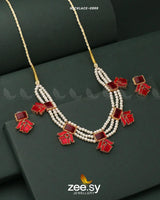 The NECKLACE-0999 is a masterfully composed jewelry ensemble, celebrated for its delicate multi-strand structure and the bold, geometric presence of its floral-inspired accents. This romantic masterpiece is skillfully fashioned with a premium Golden Finish upon a high-quality Metal Alloy foundation. Its silhouette features a stunning triple-strand pearl arrangement, beautifully punctuated with rectangular ruby-toned stones and tiered lotus-style motifs that evoke an aura of feminine grace and timeless heritage.